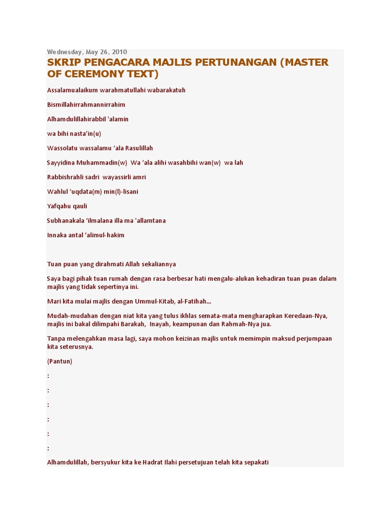 Mulakan majlis rasmi dengan bismillah dan ucapan syukur. Skrip Pengacara Majlis Pertunangan Pdf. Para jemputan semestinya dari keluarga terdekat oleh kedua belah pihak dan juga rakan-rakan rapat.